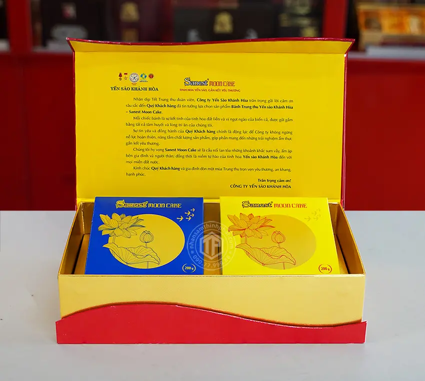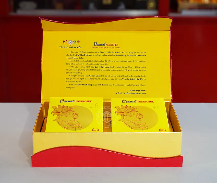 - Bánh trung thu Yến Sào nhân mềm, có trọng lượng 200 gram mỗi hộp chứa 2 chiếc bánh, đã được chế biến từ nguồn nguyên liệu nhập khẩu và nguyên liệu truyền thống qua quy trình sản xuất hiện đại, nhằm đảm bảo tính an toàn và vệ sinh.