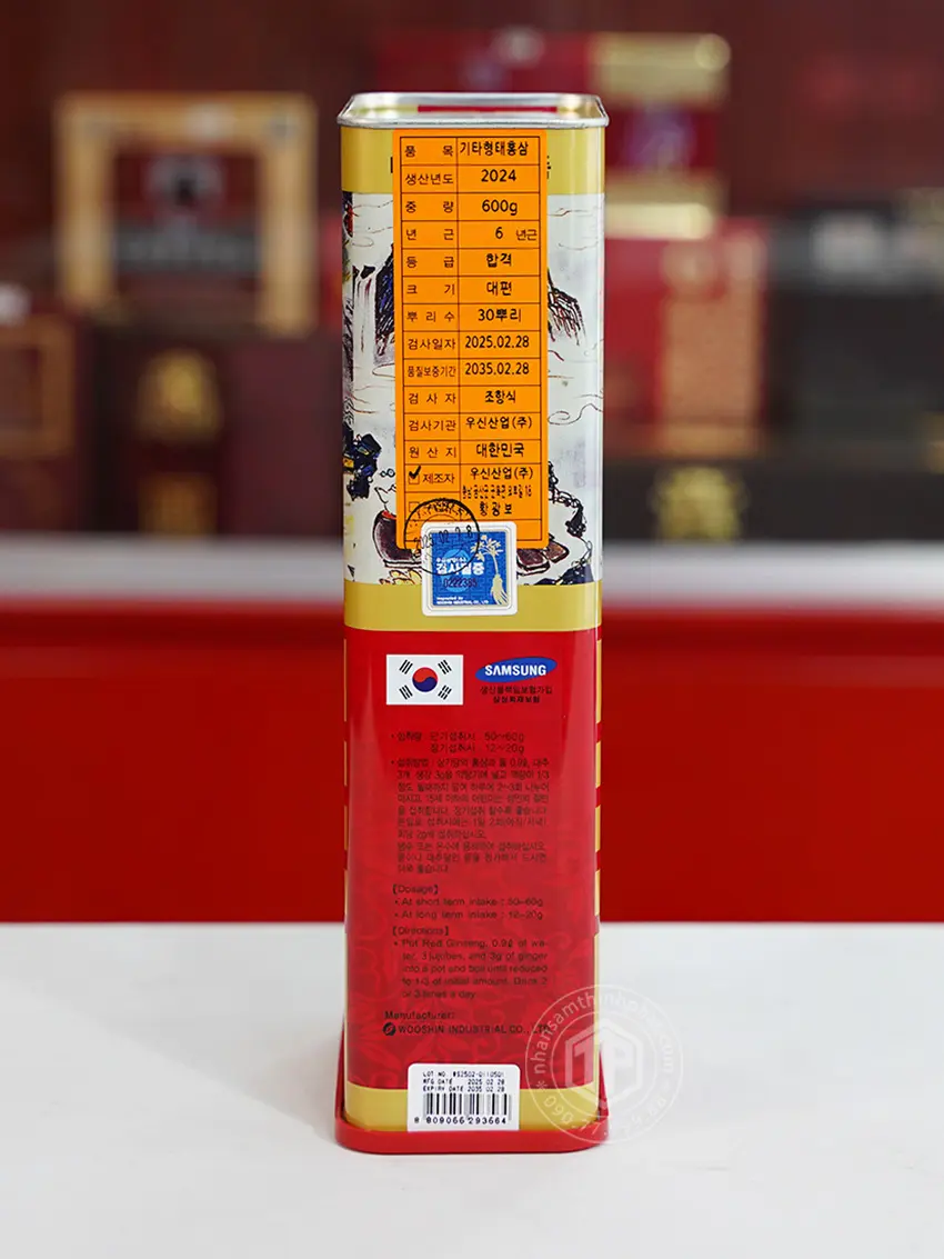 - Hồng Sâm Củ Khô Hộp Thiếc 600g Chính hãng Bio Hàn Quốc được chế biến từ những củ sâm loại 6 năm tuổi chất lượng cao, vô cùng bổ dưỡng. Với mẫu mã hộp thiếc mới và độc quyền, sản phẩm thích hợp làm quà biếu sang trọng và ý nghĩa mà bạn có thể dành tặng cho ông bà, cha mẹ, sếp hay bạn bè, người thân, đối tác, khách hàng trong những dịp đặc biệt.