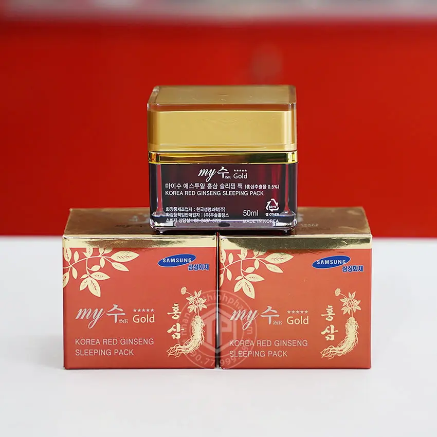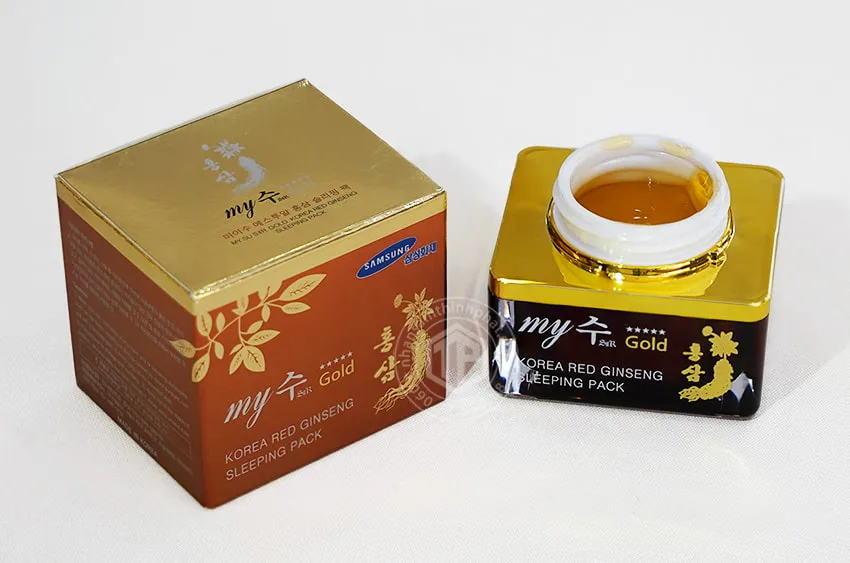 - Kem dưỡng da hồng sâm ban đêm My Gold – Sleeping Pack là sản phẩm được chiết xuất Hồng sâm, dâu tằm, trà xanh, vitamin… trong quá trình thẩm thấu kem dưỡng vào da sẽ cung cấp các dưỡng chất cần thiết hỗ trợ tái tạo làn da, đồng thời loại bỏ các thành phần có hại cho da, làm sạch và dưỡng ẩm da một cách hiệu quả