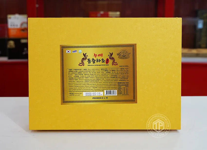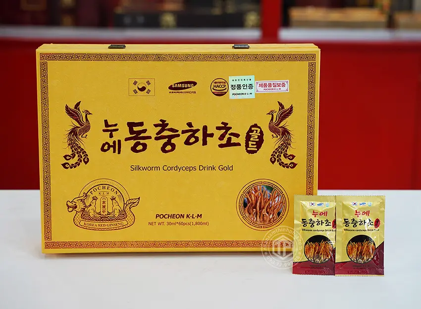 - Nước đông trùng hạ thảo Hàn Quốc hộp vàng 60 gói thương hiệu KangHwa được làm từ đông trùng hạ thảo nuôi cấy, cung cấp hàm lượng dinh dưỡng dồi dào, giúp nâng cao sức khỏe.