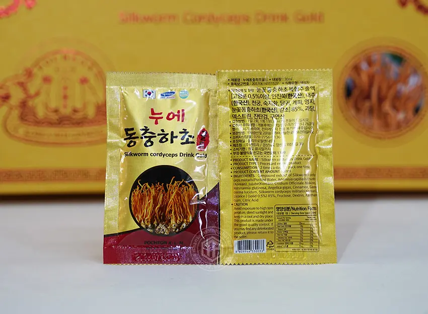 - Ngoài ra, hộp vàng 60 gói nước đông trùng hạ thảo Hàn Quốc có thiết kế đóng hộp sang trọng và dạng gói tiện lợi. Đây là món quà có giá trị đặc biệt, thích hợp để tặng cho người thân trong các dịp lễ tết, mang theo ý nghĩa đặc biệt.