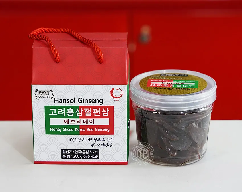 - Sâm lát tẩm mật ong Hàn Quốc hộp 200g được chế biến từ nhân sâm Hàn Quốc kết hợp mật ong nguyên chất, mang đến hương vị thơm ngon, dễ sử dụng và giàu dưỡng chất. Sản phẩm giúp bồi bổ cơ thể, tăng cường sức khỏe, thích hợp dùng hằng ngày hoặc làm quà biếu ý nghĩa cho người thân, bạn bè.