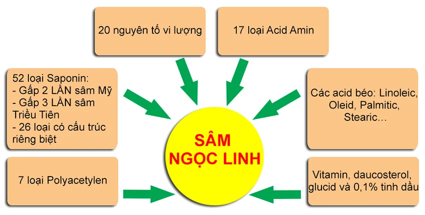 Theo kết quả nghiên cứu từ năm 1978 của Bộ Y Tế Việt Nam, Sâm Ngọc Linh chứa hàm lượng saponin cao hơn nhiều lần so với các loại sâm khác trên thế giới.