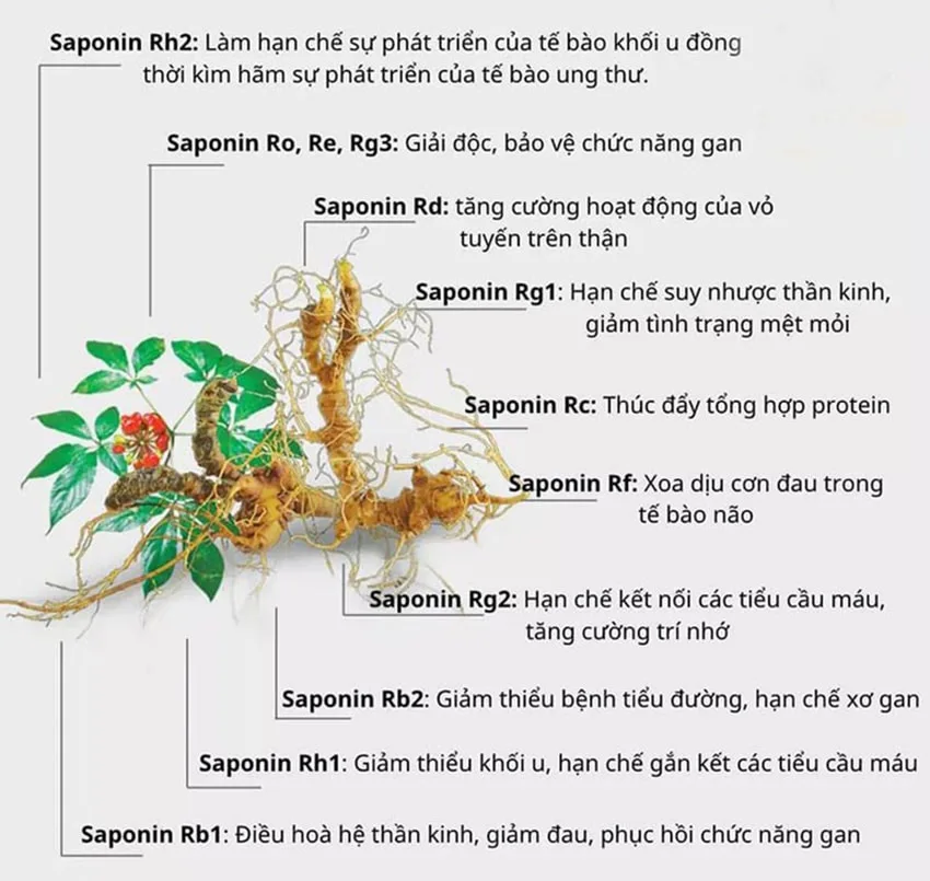 Hỗ trợ làm chậm phát triển tế bào khối u. Các phân tích khoa học cho thấy Sâm Ngọc Linh chứa các hoạt chất ginsenosides Rg3 và Rh2 lớn. Đây là thành phần có khả năng hỗ trợ kiểm soát sự gia tăng của các tế bào khối u. Khi vào cơ thể, các hoạt chất ginsenosides Rg3 và Rh2 có khả năng gây ra quá trình apoptosis– làm chết tế bào, giảm nguy cơ lan rộng và phát triển.