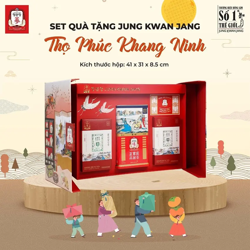 - Là set quà tặng cao cấp nhất thuộc BST phiên bản giới hạn Limited Edition của Hồng sâm Jung Kwan Jang, THỌ PHÚC KHANG NINH đại diện cho lời chúc "Tứ Phúc" bao gồm "Thọ" của trường thọ, "Phúc" của hạnh phúc, "Khang" của khỏe mạnh và "Ninh" của bình an. Sự kết hợp giữa Lương Sâm Nguyên Củ thượng hạng và Nước sắc hồng sâm Pure Extract là lựa chọn quà tặng hoàn hảo cho những vị khách quý thường xuyên dùng sâm nguyên chất, yêu thích hương thơm và vị đắng thuần của hồng sâm Hàn Quốc.